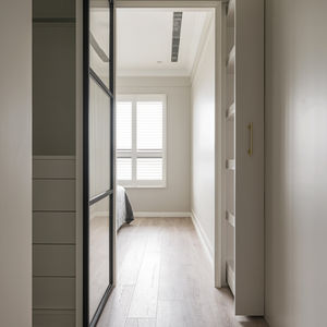 主臥內,更衣收納和睡眠的空間徹底區分開來,廊道與睡眠區界以一個收框的設計,意在修飾樑牆結構與增加美感。走入式更衣室位於進入休憩區的通道上,這個緩衝空間讓臥室的睡眠區更加舒壓,封閉式收納空間則有效淡化生活感使視覺乾淨,心情放鬆。多元化光源設計下,主要照明和營造氣氛照明自由切換變化出各種空間樣貌,幾個角落單獨打上聚光燈時,更是將精品飯店般的視覺印象瞬間點滿。
