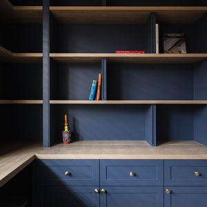 打開大門,透過玄關的美式玻璃格子窗可望見矗立在山景之間的101大樓,半開放書房中顯眼的深藍色與木質滿版書櫃設計在角落自成一個天地,也理所當然成為了公領域景深的一部分。無論何時在漂亮的餐廚櫃角落為自己萃一段coffee break的時間,這些片段形塑出日常生活滿滿的儀式感。